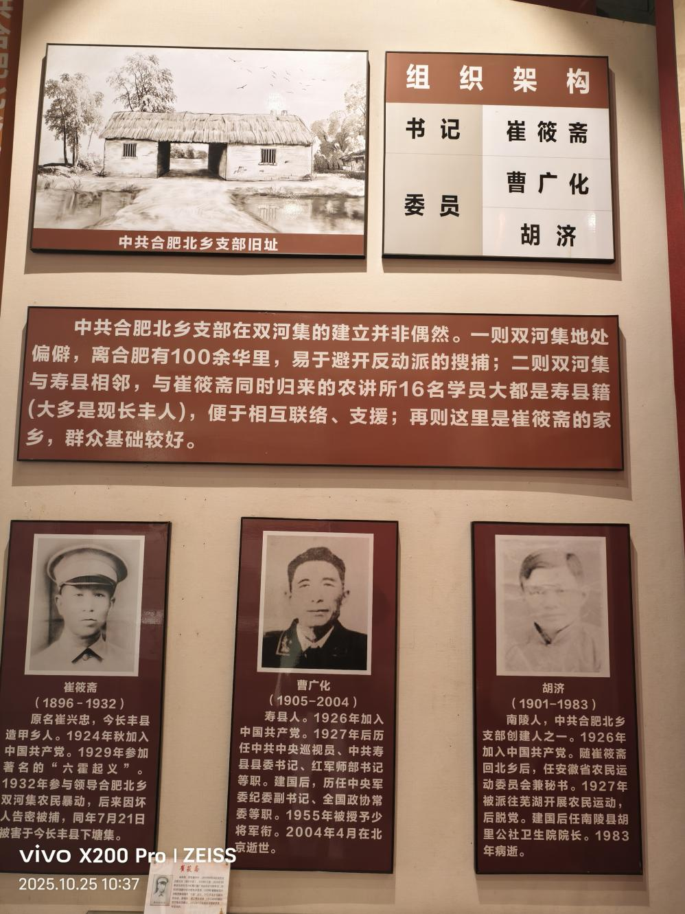 1926年3月,经党组织选送,三人一同赴广州参加毛泽东同志主办的第六届农民运动讲习所学习。在农讲所期间,他们系统学习马克思主义理论与农民运动策略,还曾赴海丰等地实地考察农运工作。结业返乡后,三人立即投身革命实践,于同年9月组建中共合肥北乡党支部,点燃了合肥地区农民运动的烽火。1927年3月,胡济曾任芜湖农会主任,积极推动当地农运发展;1932年7月21日,崔筱斋在领导双河集农民暴动时因坏人告密被捕,英勇就义于长丰县下塘集;曹广化在新中国成立后,于1955年被授予少将军衔,曾任中国人民解放军军事检察院检察长、中央军委纪委副书记等职,为军队建设作出重要贡献。
